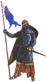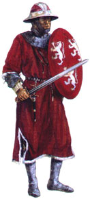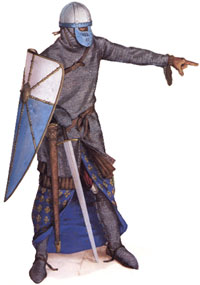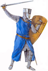 Воин, изображенный здесь, носит сюрко из дорогого шелка, привезенного, очевидно, из соседнего мусульманского государства. Вооружение показывает характерный стиль для Иерусалимского королевства в последние годы его существования. Это шлем с бортами - шапель, меч, подвешиваемый к перевязи, а не на портупее, ранней формы кинжал - базелард, легкий овальный щит, специально приспособленный для защиты спешенного осаждающего.