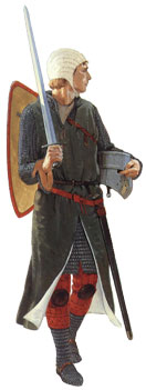 Этот рыцарь экипирован по самой последней "моде". Несмотря на то, что некоторые воины выглядят все еще так же, как и те, что бились при Гастингсе, изменения происходят. Нижний край кольчуги укоротился до размера чуть выше колена, к рукавам приплетены кольчужные рукавицы с ладонью из грубой ткани. Ноги защищены кольчужными чулками. Шнурок под коленом, продетый сквозь кольца, не дает провиснуть чулку. Поверх кольчуги теперь носится сюрко, опоясанное на талии. Сюрко не украшено гербом владельца, что нетипично. Шлем - цилиндрической формы с плоским верхом, на нем жестко прикреплена закрывающая лицо маска. Для вентиляции в ней пробиты отверстия. Шпоры так остались шиповидными, но концы их теперь изогнуты, чтобы лучше прилегать к лодыжке. Форма щита изменилась от миндалевидной к почти треугольной. Также щит уменьшился и в размерах. Меч - самого последнего типа, слегка сужающийся, с относительно коротким долом. Навершие рукояти - "яблоковидной" формы, что будет очень распространено в следующем веке. У ремня, на который крепятся ножны, раздвоенный конец продевается сквозь отверстия в другом конце и завязывается. Именно так делалось большинство перевязей в 12-13 веках.